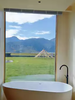 ❶ The rooms feature large floor-to-ceiling windows, offering breathtaking views of the natural landscape, where snow-capped mountains and grasslands bring healing and a sense of vastness.