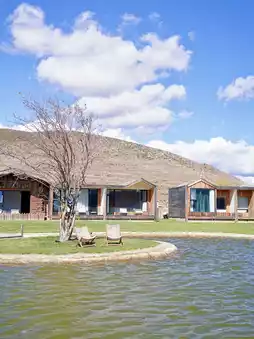 surrounded 360° by snow-capped mountains, grasslands, and wetlands,