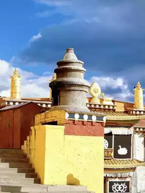 the prayer wheels of Dukezong Ancient Town are bathed in golden sunlight.