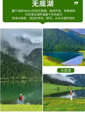 !Bottomless Lake Hiking: The Emerald Pearl in the Secret Realm (Altitude about 3800m) The lake water is as clear as emerald, reflecting the surrounding forests and distant snowy mountains (Xianrigang, Chuka, etc.). The lakeside is an open alpine meadow, covered with wildflowers in summer, with cattle and sheep grazing leisurely, peaceful like a paradise. The lake is surrounded by primeval forest, with autumn foliage coloring the woods.