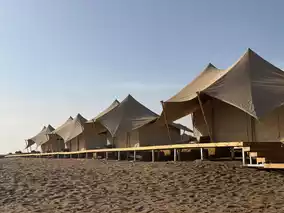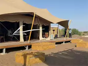 Tents stand amidst the desert, resembling ancient caravan camps from afar. Upon closer inspection, they reveal a warm and luxurious interior. Soft carpets and understated yet exquisite lighting blend desolation with comfort seamlessly. At dusk, soaking in the outdoor hot tub while watching the sunset paint the dunes a rosy hue feels as if the entire desert is whispering to us.
