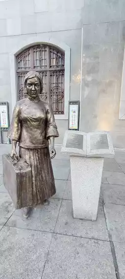 The statue of the female student is of Ms. Shi Meiyu, the first female student from China to study abroad and the first female Western doctor in China. She returned to China in 1920 after studying in the United States and, together with an American female missionary, founded the "En Dian Tang" (located on Waima Road, which we passed by later).