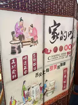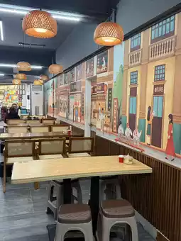 The ambience of the restaurant is cozy. It blends traditional Chinese charm with a comfortable, casual dining setting. The decor features illustrated murals depicting old-style street scenes and family cooking moments, evoking the atmosphere of classic Chinese towns.