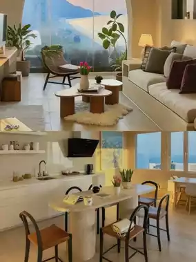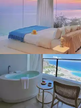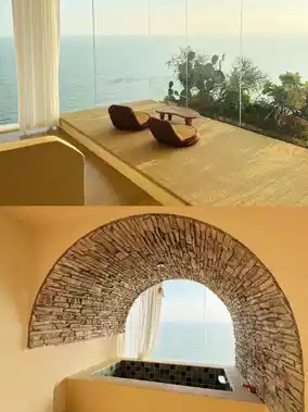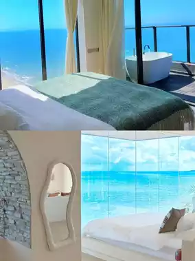 The hotel features a spacious seaview balcony 🌊. Floor-to-ceiling windows frame golden sands and endless ocean like a living painting—wake up to sunrise over the water or unwind with sunset hues 🌇. The room radiates cozy Instagram charm with wooden furniture and plush bedding 🛏️, creating a dreamy coastal retreat the moment you open your eyes ✨.