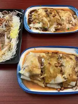 Nizaijie Egg and Pork Sausage (~10 yuan): Nizaijie is a Shanwei dish made with a mixture of squid, pork, and other ingredients. Adding it to rice rolls gives it a slightly squid-like aroma, which is quite flavorful. The steamed beef rice noodles were also delicious! Shanwei's rice noodle rolls are often served with a light sweet and spicy sauce.