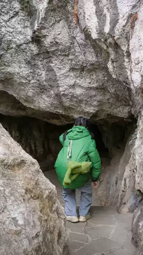 There are many white doves at the entrance to the cave. They are not afraid of people.