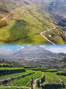 Leaving the parking lot, you will arrive at Dongcheng Village, and after a stretch of road, you will see the entrance to the thousand-year terraces. After viewing the terraces, climb up the stone steps, and in half an hour, you will reach the beginning of the Millennium Stone Waves. The stone wave trail is quite long, and there is a path on the right side if you cannot climb anymore, you can retreat at any time. After experiencing the stone waves, you can continue to climb to the top of Fuchun Mountain to overlook the entire terraced fields and the surrounding mountains, then follow the signs to descend.