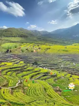 Fields of terraced rapeseed flowers blanket the mountainside, and from the summit, the view is like a stunning spring scroll. The terraces cascade down from the mountainside, arranged in a well-ordered fashion, with the golden 'waterfalls' set against the green mountains, creating a spectacular sight. The terraced fields, which cover more than 2,300 acres and number over 23,000 of varying sizes, have a history of at least five hundred years and are all built from rocks from the Quaternary glacial relic—the 'stone glacier'.