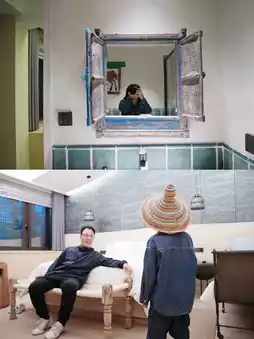 African leather drum bedside tables, mirrors made of wooden windows with African patterns, tiger-shaped chairs, masks of different shapes, ammonite fossils embedded in the floor, twisted glass water tanks...