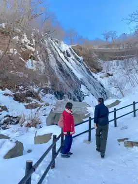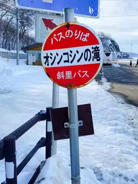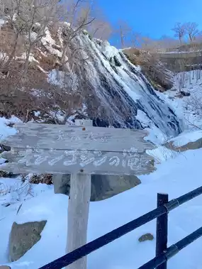Drift ice and Oshinkoshin Falls. When I parked my car in the parking lot, I was impressed by the sea in front of me, covered in drift ice. I tried to climb up to the front of Oshinkoshin Falls, but it was steep and I slipped on the snow, so I gave up. It is a branching waterfall, and one of the two falls is not Oshin or Koshin, but Nijo Falls, so it is named Oshinkoshin. Especially during the drift ice season, the sea of drift ice as far as the eye can see is a magnificent sight. It is a recommended tourist spot where you can see drift ice along with the waterfall that is popular all year round.