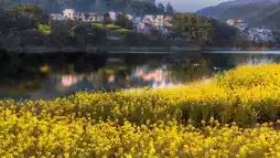 In late March, during the peak blooming period, the rapeseed flowers are in full bloom, covering the land in a golden hue, which, along with the surrounding green mountains and waters, forms an incredibly beautiful sight.