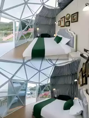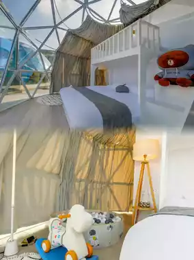 The Shengsi Fisherman's Little Fish·Star and Sea Camping Base has a total of 12 bubble houses, named after the twelve zodiac signs. The panoramic bubble houses are surrounded by the starry sky. Even in the wilderness, you can enjoy five-star accommodation with fully intelligent room configurations including smart blackout curtains, smart air conditioning, and a full range of toiletries. Each room has its own courtyard, a separate water dispenser, and a telescope, connected by an oxygen-rich wooden walkway.