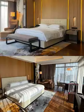 🛏Comfortable room: I stayed in a standard room, which is 45 square meters, and the space is spacious. The bedding is soft and comfortable, and there is an intelligent control system. The 180-degree floor-to-ceiling windows have a great view, overlooking the city of Shenyang. The marble bathroom is clean and bright, with a large bathtub, and a bath is very relaxing.