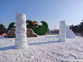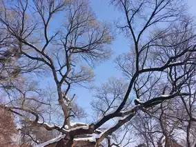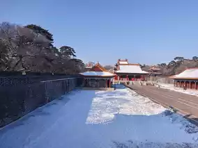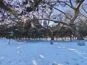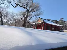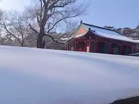 History and nature blend perfectly in Dongling Park. The red buildings and white snow complement each other, and the ancient trees are tall and graceful. I am captivated by the snowy scenery.