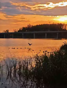 As the sun sets, the afterglow gilds the lake's surface. The shimmering water ripples with the breeze, scattering the twilight into sparkling diamonds. Occasionally, birds skim across, drawing graceful arcs over the glistening waves. The reeds along the shore sway in the wind, their slender leaves dyed amber, rustling softly as if humming a twilight love song.