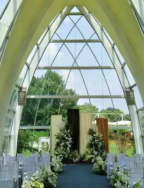 As the morning light casts a soft glow over the lawn of Joy Garden Wedding Theme Park, the magical patterned art installation in Lisa Garden complements the Mediterranean-style architecture beautifully. Walking along the stone path on the royal lawn, the rounded arches and white-green floral arrangements outline European romance, while the breeze sways the ribbons in arcs that harmonize poetically with the natural wood textures of the Ayana Ceremony Hall in the distance. Pressing the shutter in the Light Gathering Forest, the fragmented luster reflected by mother-of-pearl decorations intertwines with the forest light and shadows, each frame imbued with the ritual sense of love.
