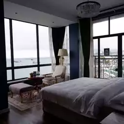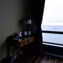 A floor-to-ceiling glass window faces the sea view🥰, the double bed also faces the sea view😍, and there is a small terrace, but the door lock is broken😅. There is also a desk, a coffee table and a large hairdressing chair. The bathroom is exactly the same, large and comfortable.🥹You can really stay in the room and watch the sea for half a day.