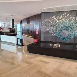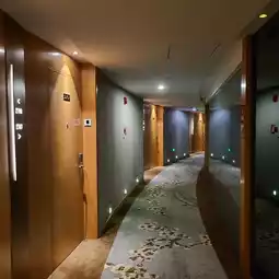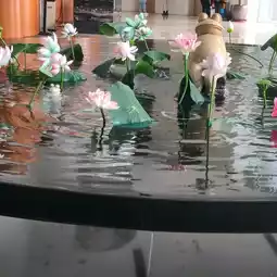 There is a beautiful lotus pond on the left side of the underground lobby that attracted me to sign in (Figure 3). I took the sightseeing elevator to the hotel lobby on the 23rd floor. The lobby is very spacious and beautifully decorated. There are many sofas for tourists to rest, and there are free drinks. Cheuk-in is very smooth, and the waiters are enthusiastic and polite. The hotel rooms are located on the 25th to 36th floors, and my floor is on the 27th floor. When I walked out of the lobby, I saw two sofas, a free weight scale and free weight scales. The facilities were complete, and I reached my room through a circular corridor.
