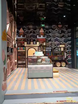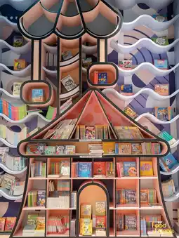 Children have their own children's area, which uses pink tones, bookshelves made to look like castles, and carousel chairs to attract children's attention and encourage them to sit and read.