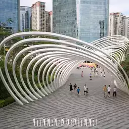 The design of the recreation park is very unique, and many children are playing in the small pool.