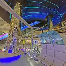 As the ladder reaches the top level, what rushes into view is the technological planet furnishings and large wall projections, magnificent 3D screens, jointly create the feeling of being in space.