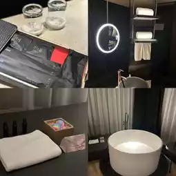 The large bathtub is in the corner, you can look at the 270-degree scenery 🌁 and there is a dark slot on the ground floor for draining water, so you don't have to worry about the whole room getting wet😜
