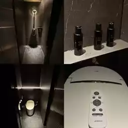 Smart automatic toilet seat, even flushing the toilet must use the remote control, really advanced so much bathroom, spacious space, toiletries are quite good, at least not two-in-one, three-in-one d garbage.