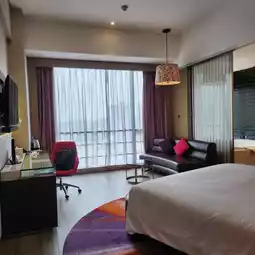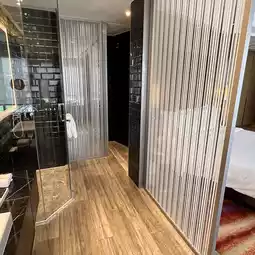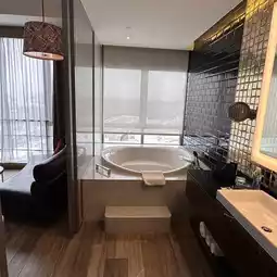 The hotel's rooms are very spacious, with approximately 430 square feet of space, and are innovatively designed and maintained to a very high standard of cleanliness. The room was equipped with a large bathtub where I could relax. This design makes people feel comfortable and happy, adding a special sense of luxury to the accommodation experience.