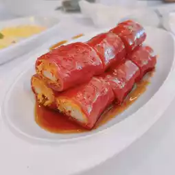 The crispy red rice crust envelops the flavor of shrimp spring rolls