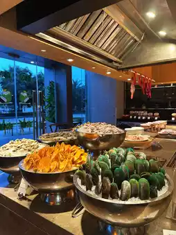 A spacious room with a rich buffet dinner