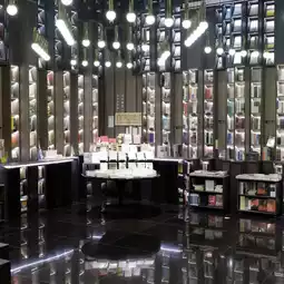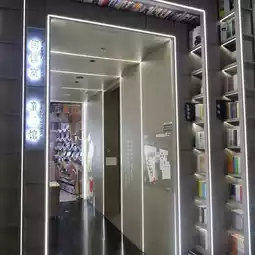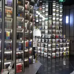 On the other side of the book wall, the black bookshelves reach the ceiling, and the lights are reflected on the pure black floor. The stacked bookshelves and the light and shadow reflected from the floor further enhance the sci-fi atmosphere.