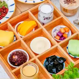 Blueberry ice cream balls, black glutinous rice, grass jelly, mango, fresh milk