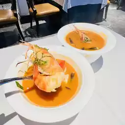This dish is based on Thai Tom Yum Goong soup, but the chef adds some special secret ingredients to make it more unique. The soup tastes spicy and sour, with a rich aroma of spices and herbs.