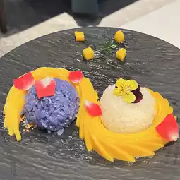 This dessert is based on fresh mango and sticky rice, combining the sweetness and texture of Thailand. Beautiful presentation! The sweetness of mango and the stickiness of sticky rice combine perfectly, presenting a refreshing and pleasant taste.
