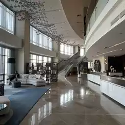 The hotel lobby is located on the 23rd floor. It is comfortably and elegantly designed with soft lighting, quiet music, and a view overlooking the Huaqiang North city landscape. The overall view is very good, and the overall feeling is high-end, light luxury, and has a sense of design.