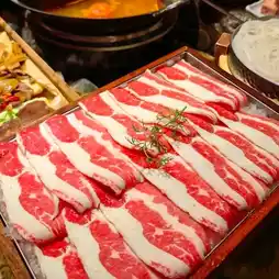 The premium beef is alternately fat and lean. The beef slices are sliced very thin and melt in your mouth.