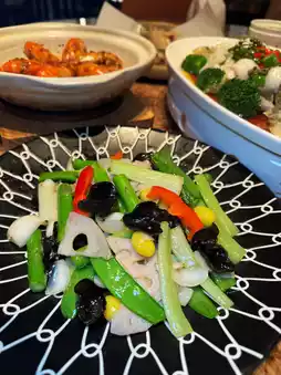 When the dish is served, lemon leaves, green onions, pickled ginger, fried burdock, coriander, cucumber, peanuts and sesame oil are added to the side. The waitress will help with the "fishing up" ceremony.