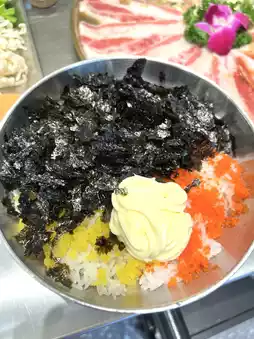 A large bowl of bibimbap, served with plenty of crab seeds, seaweed, and pickled carrots