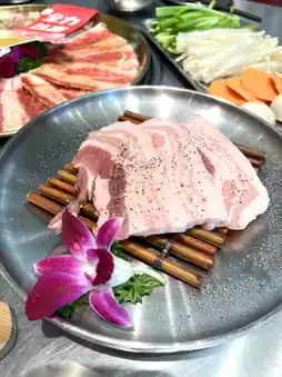 Thick-cut pork belly, alternately fat and lean, grilled until golden brown, very fragrant