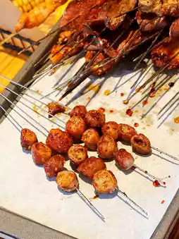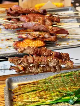 The variety of skewers is rich, including meats, seafood, and vegetables, all with an excellent price-quality ratio