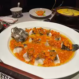 Don’t think that seeing so many peppers means it’s spicy! It’s actually not spicy at all! The fish meat is fresh and tender, and has no fishy smell. I don’t like fish very much, but this is great👍🏻