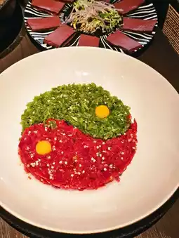 🥩Fresh Pepper Tai Chi Beef: Tai Chi shape is very igable! The top layer is covered with red chili and green chili crushed, immediately mix the egg yolk, cooked spicy and tender, melt in your mouth!