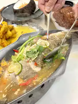 Served on the stove, the fish is hot and sweet and tender. The soup is sour and spicy with milky flavour, which enhances the freshness and appetizer of the fish