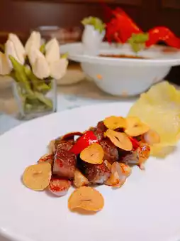 I feel happy eating this wagyu! ❤️ The surface of the Wagyu beef is lightly fried and slightly crispy, and the meat is soft and juicy. The aroma of beef and oil fills your mouth after you bite into it. The garlic slices were fried so crispy that I couldn't help but eat a few pieces.