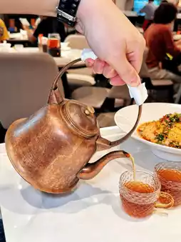 In addition to pears, the ingredients are white fungus, silver fungus, wolfberry, rock sugar, and brown sugar. Served in a copper pot, the portion is plentiful. It is warm and sweet and very comfortable to drink!