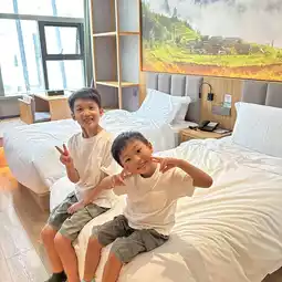 🛌We stayed in a selected double room this time, the room is wooden design, there are 2 1.1 meters wide single bed, but 2 large 2 small sleep a bit small, there is also a lounge area, perfect for supper at night.