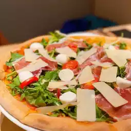 Thin and crispy pizza base, a perfect blend of lots of cheese, rocket, ham and other ingredients