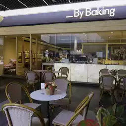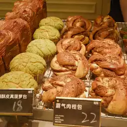 The interior is like an ordinary bakery, with large glass cabinets displaying various types of bread.