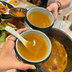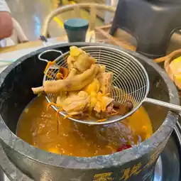 The wild mushroom hot pot made with fresh chicken, the soup is particularly fresh and sweet 👍🏻 I drank two or three bowls! The shopkeeper boils fresh chicken and various wild mushrooms in the soup! Then he will also help us with the alarm clock!