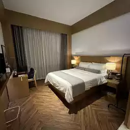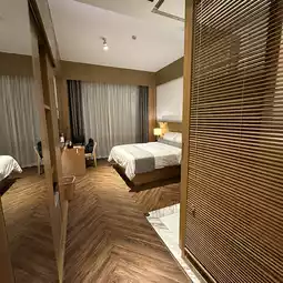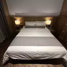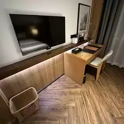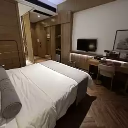 The room is approximately 28 square meters and is located on the top floor of the hotel (8th floor). It is mainly decorated with simple wood style. The bathroom is designed with sliding doors, which clearly separates the dressing room and the bed, and has a good sense of space.